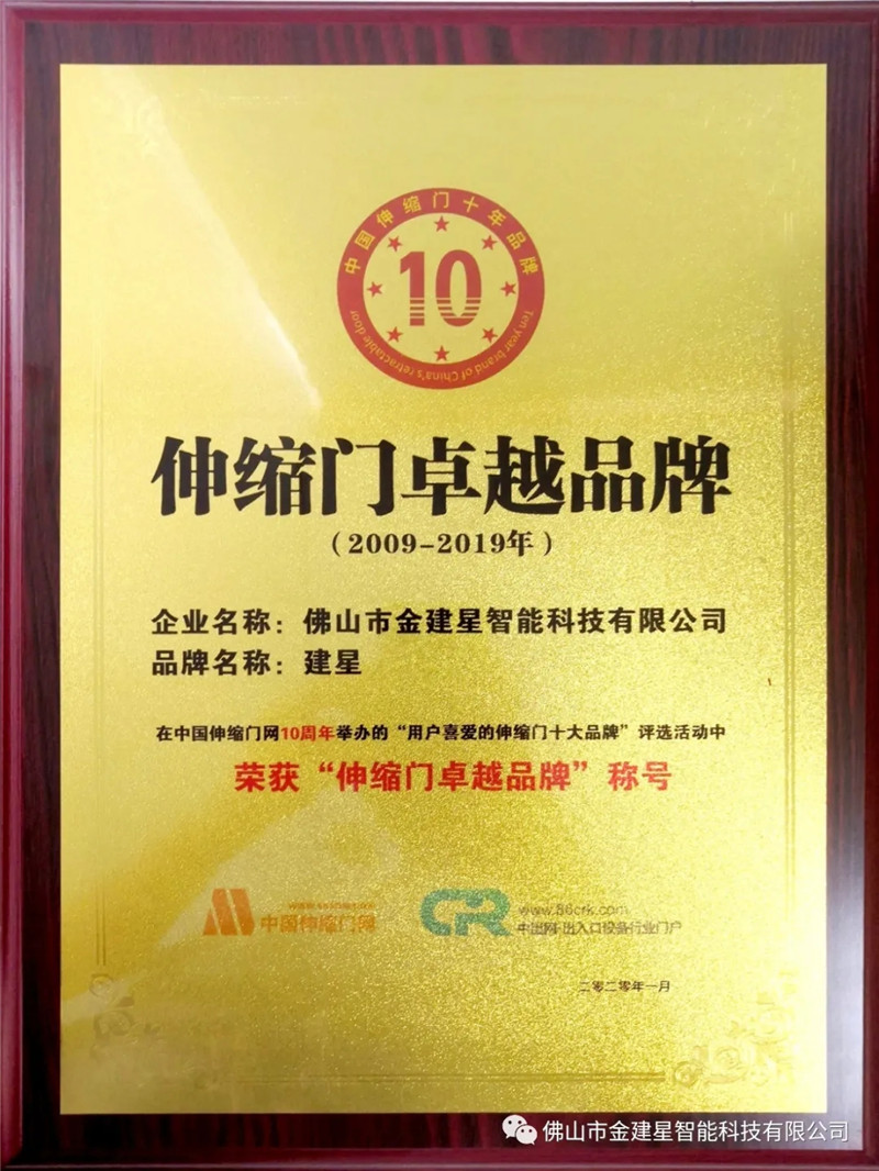 然而“伸縮門卓越品牌”大獎的評選條件是非常嚴峻的,必須要連續十年榮獲十大品牌的獎項,在入選的所有企業中嚴格評選出兩家,而建星智能憑借産(chǎn)品過(guò)硬,企業綜合實力強等條件脫穎而出,非常榮幸的成爲其中一家!